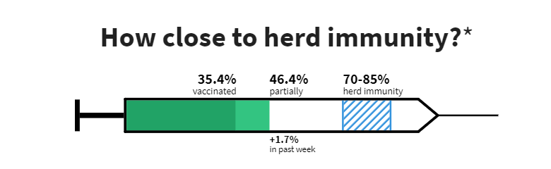 根据美国CDC的疫苗接种的官方数据显示, 截至目前,仅有46%的美国人完成了第一针接种,完成两针接种的人则只有35%,远远低于70%的接种目标。