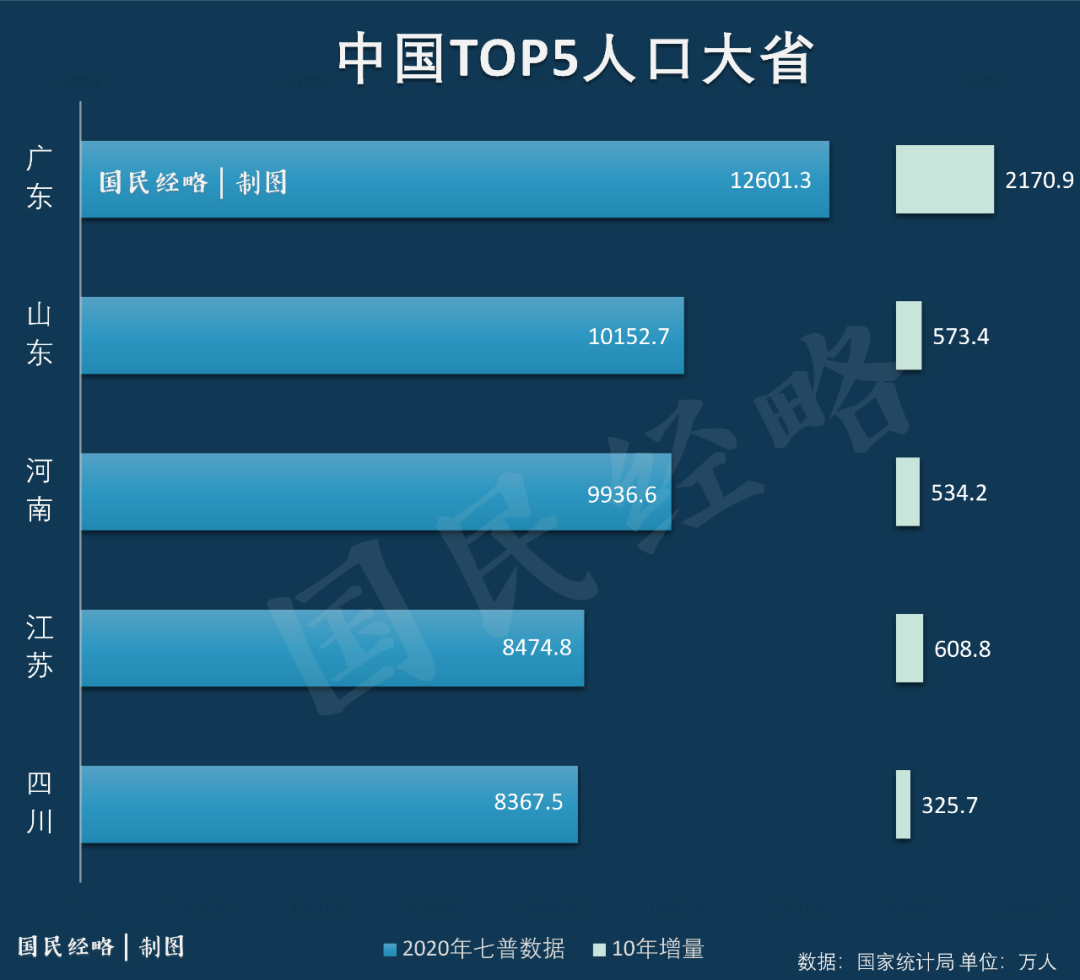 值得一提的是,与2019年官方公布的常住人口相比, 广东大增1080万人,其中广州多了337万,深圳多了412万。 显然,这并非广东一年就新增1000多万人,而是过去常住人口被低估。 众所周知,人口普查10年一次,数据相对客观,而普查年份之外,多是抽样调查为主,存在各种各样的误差。 这一次,广东借人口普查多释放出1000多万人口,广州、深圳、东莞、佛山人口同时创下新高。 03 广东,已经是不折不扣的人口第一大省。 根据七普数据, 中国常住人口最多的5个省份是: