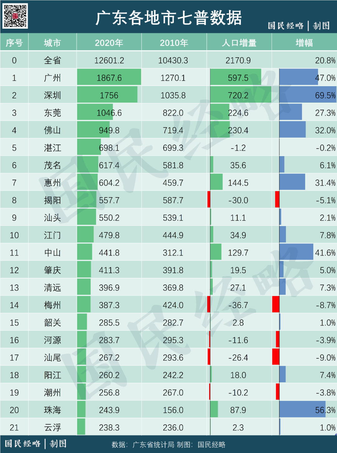 未来几年,广州、深圳有望双双冲击2000万大关。 广州、深圳之后,东莞率先跨过千万人口大关,佛山则接近千万大关。 2020年东莞常住人口高达1046.66万人,相比2010年增长224万。佛山常住人口949.89万,相比2010年增长230万。 佛莞两地人口增量,超过北京、上海、天津,广东人口吸引力可见一斑。 02 此消彼长背后,是广东人口一路飙升。 与2010年“六普”时相比, 广东常住人口大增2170.9万人,增量位居全国之首。