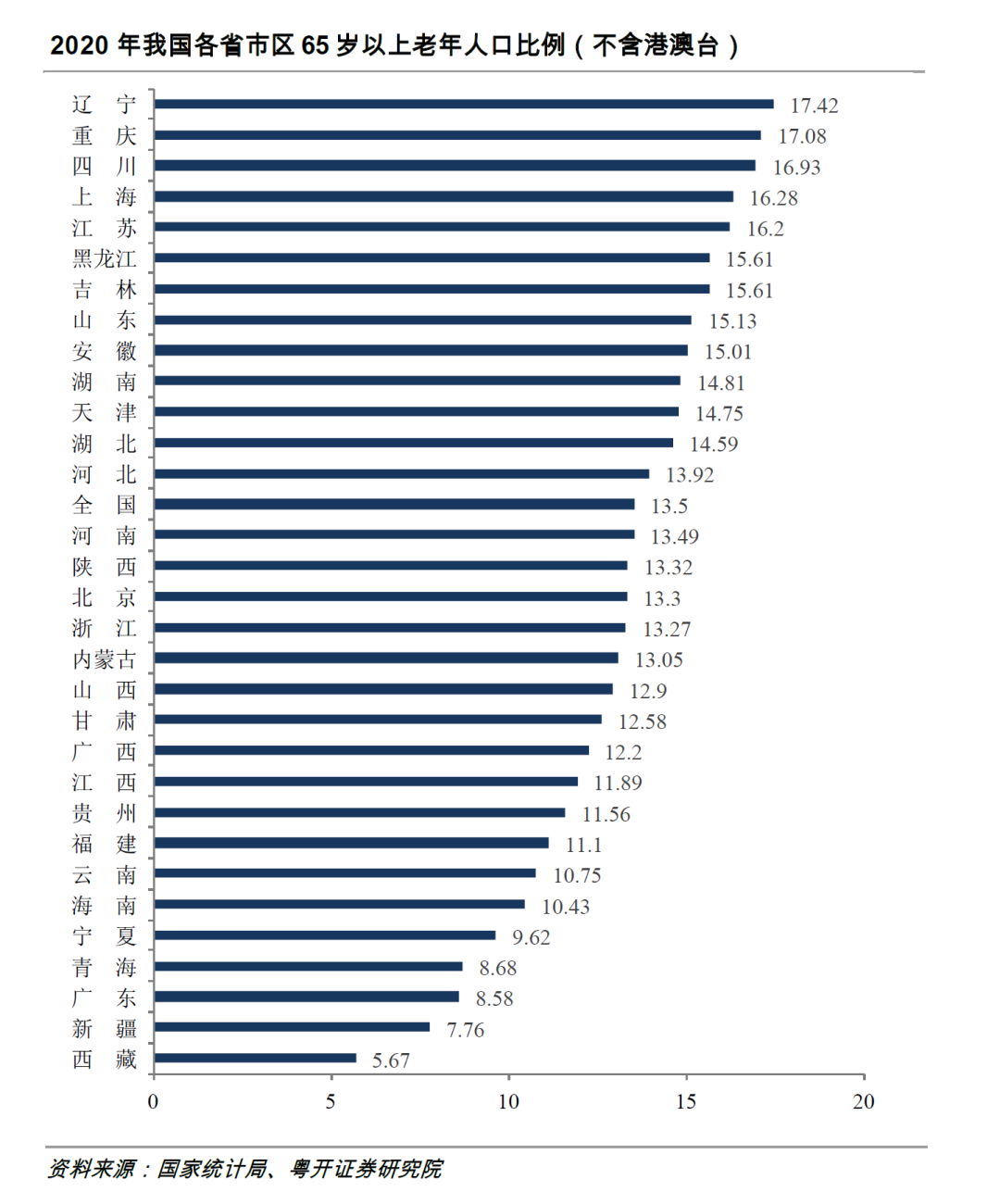 而作为东部发达省份的 上海、江苏分别高达16.28%、16.2% ,西部的四川、重庆双双超出16%。 一般而言,老龄化率超过14%,意味着进入深度老龄化阶段。上海、江苏、四川、重庆、辽宁等省市,老龄化问题已经相当突出。