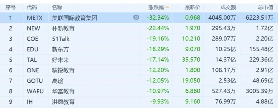 一消息引发教育股全线暴跌!校外教育的冬天来了 作者:知识星球找老齐的读书圈 昨天晚上,涉及校外培训教育的中概股,在美股上全面崩溃,美联国际教育跳空大跌32%,朴新教育跌了22%,好未来下跌17%,盘中一度跌幅也超过了20%,新东方跌了18%,高途教育跌幅也达到12%。可以说是相当惨烈?而且这些教育类中概股,今年可谓是全面崩盘,比如朴新教育,春节前还在9美元以上,如今已经跌到了2美元以下,跌幅超过8成。高途教育也就是之前的跟谁学更惨, 从149跌下来的,现在只有18.6美元,跌了快9成了。投资者可谓是损失惨重,那么到底怎么了?