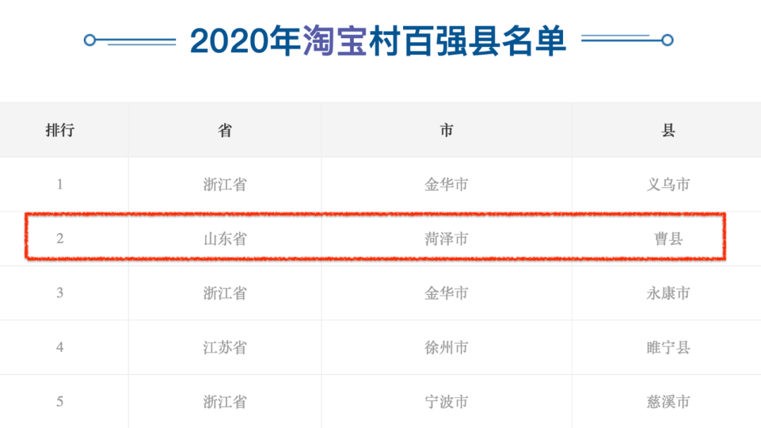 在阿里发布的《2020年淘宝百强县名单》中, 曹县也以17个淘宝镇、151个淘宝村的数量位列全国第二。