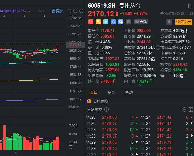 5月22日,证监会主席易会满在中证协第七次会员大会上提出,证券行业的高质量发展,绝不仅仅是做大规模,更重要的是紧紧围绕主责主业,在做专做优做精做强上更加努力。业内人士称,易会满的讲话透露的主旨有望提振券商板块交易情绪,对券商板块影响偏积极。另外还有机构指出,近期市场流动性充沛、利率往下、大宗商品价格下行、打击虚拟货币等均在策略角度利好券商股。 茅台大涨近5%,市值重回27000亿