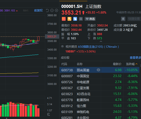 5月25日,A股三大指数高开高走,截至午盘,沪指上涨1.6%,创两个月来新高,创业板上涨2%,站上3200点。