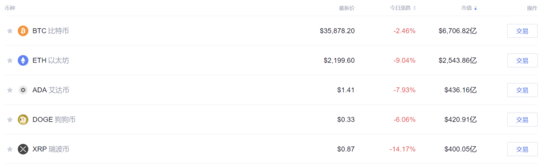 第二大加密币种以太坊(ETH)同期跌9.04%,报2199.6美元,总市值下降至2543.86亿美元。