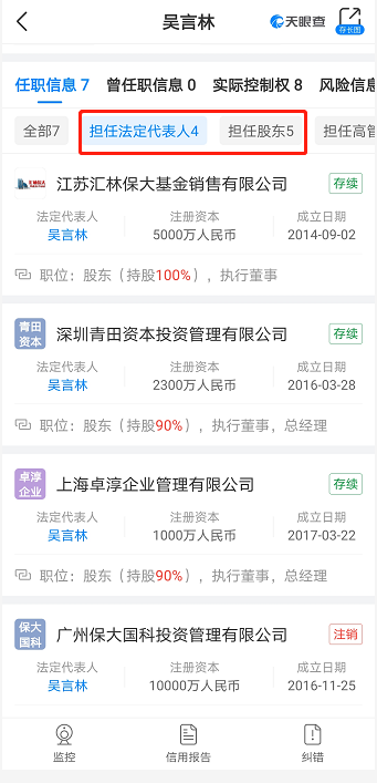 除了任职第三方基金销售公司外,天眼查数据还显示,吴言林还在其他三家公司担任法定代表人,目前他还担任深圳青田资本投资管理有限公司、上海卓淳企业管理有限公司的法定代表人,两家企业分别设立于2016年3月、2017年3月,他的个人持股比例都达到90%。另有一家他担任法定代表人的广州保大国科投资管理有限公司,成立于2016年11月,目前已经注销。