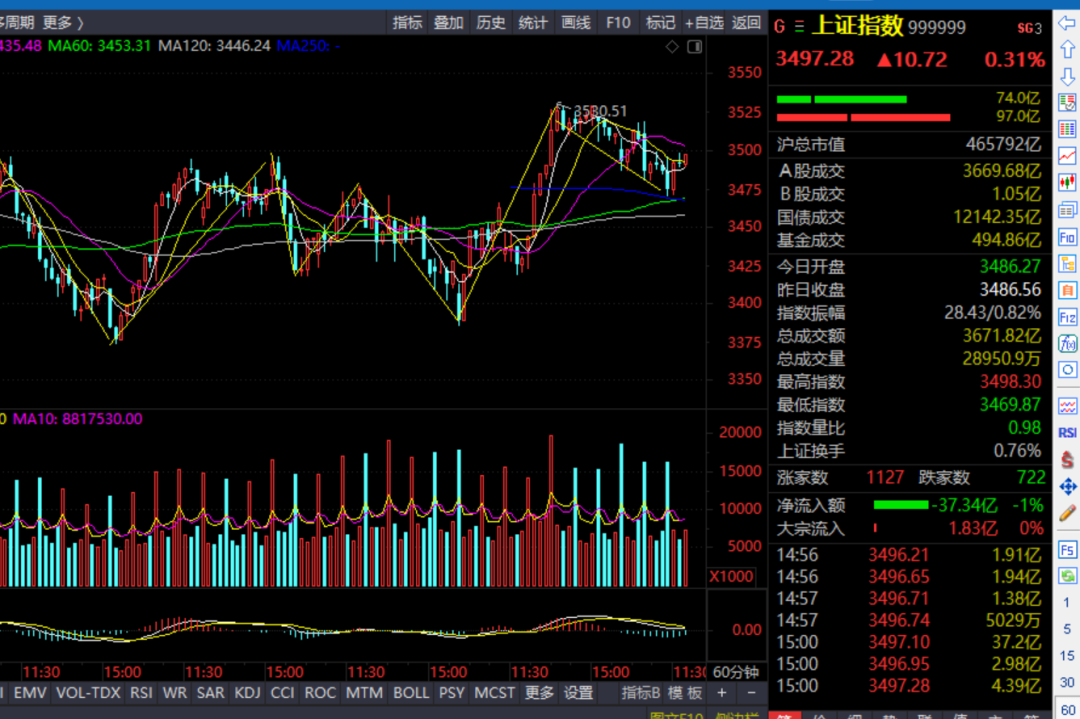 目前3450不破的情况下,市场继续有望上涨。短线上看3500点的阻力,波段看是否突破3530点,如果真有效突破3530点,那么这波行情基本上就确立了。