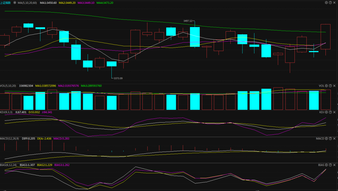 周二探底回升后复盘分析说“ 日线金叉,从技术上看本周接下来的交易日反弹向上是大概率,但是无量不会像火箭升空,震荡反复也是避免不了的 ”。周五在金融的推动下数蹭蹭的突破了60日线,整个盘面做多氛围都活了起来,技术上看低点抬高,做多形态不变,很多人开始YY牛市来了,个人观点是距牛市还有较远距离,不过短期不担心会单边大跌,下周还有新高。对于创指本周的判断稍微显得有点谨慎了,不过中期之前分析过创指是震荡向上的形态的,周五指数重返3000点,表现超预期。 综合:对于指数我近期的观点都偏乐观,周五突破60日线,量能也没有掉链子,小幅放量,整体周五的大阳线增添了下周突破3500点的信心。 周末外围继续收涨,消息面也还算中规中矩,技术上做多信号较为明显,综合判断 明日继续高开然后向上突破周五新高是大概率,盘中注意量能变化,无量或许会有震荡回踩60日线附近的走势。操作上,重仓的3500点附近是高位兑现降低仓位的机会。 更多详细判断 明日会在早盘文章详聊。