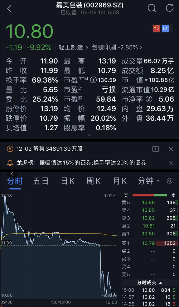 9月9日,嘉美包装上演天地板,换手率达69%,成交金额8.25亿元,全天振幅20%!