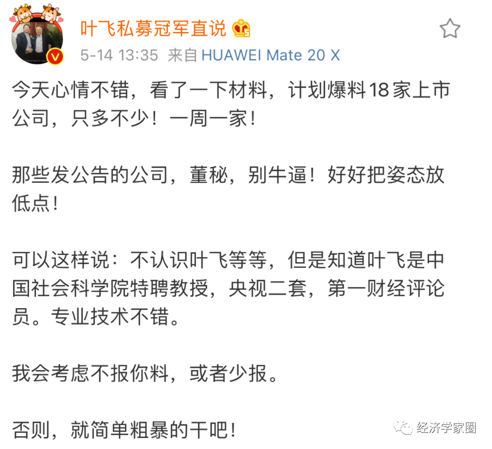 5月14日,叶飞表示,他计划陆续爆出18家上市公司此类违规操作,只多不少。