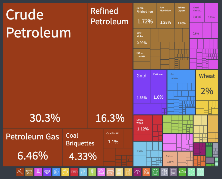 这张图就是俄罗斯出口的百分比,左边红呼呼的都是能源出口。