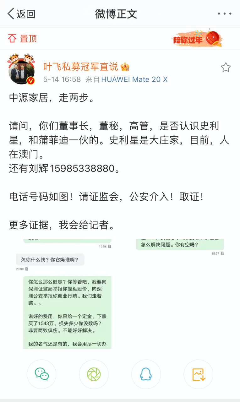 在此之前,叶飞就在微博上表示,如果中源家居董事长、董秘等不及时联系他,不认真处理,而是赖账或者继续骗他,他将向中国证监会实名举报。