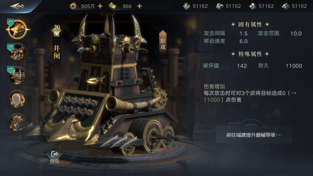 除此之外,“4+1”中的“1”也是不可忽视的部分,器械作为一个战术单位,它扩宽了阵容搭配的策略维度,玩家可以选择不同的器械来弥补阵容短板或放大阵容优势,比如井阑可充当前排,战鼓可增加全军伤害等。