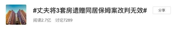 截至5月3日,“丈夫将3套房遗赠同居保姆案改判无效”的微博话题,已有2.7亿阅读,并引发网友热议。