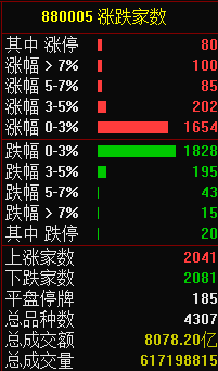 三大指数全线高开,开盘短暂震荡后开始跳水翻绿,创业板一度跌超1%,随后全天水下弱势震荡,截止收盘,三大指数收实体阴线,上证指数失守3500点,两市总成交额8078亿,盘面个股涨跌互现,北向资金净流出5.78亿元。