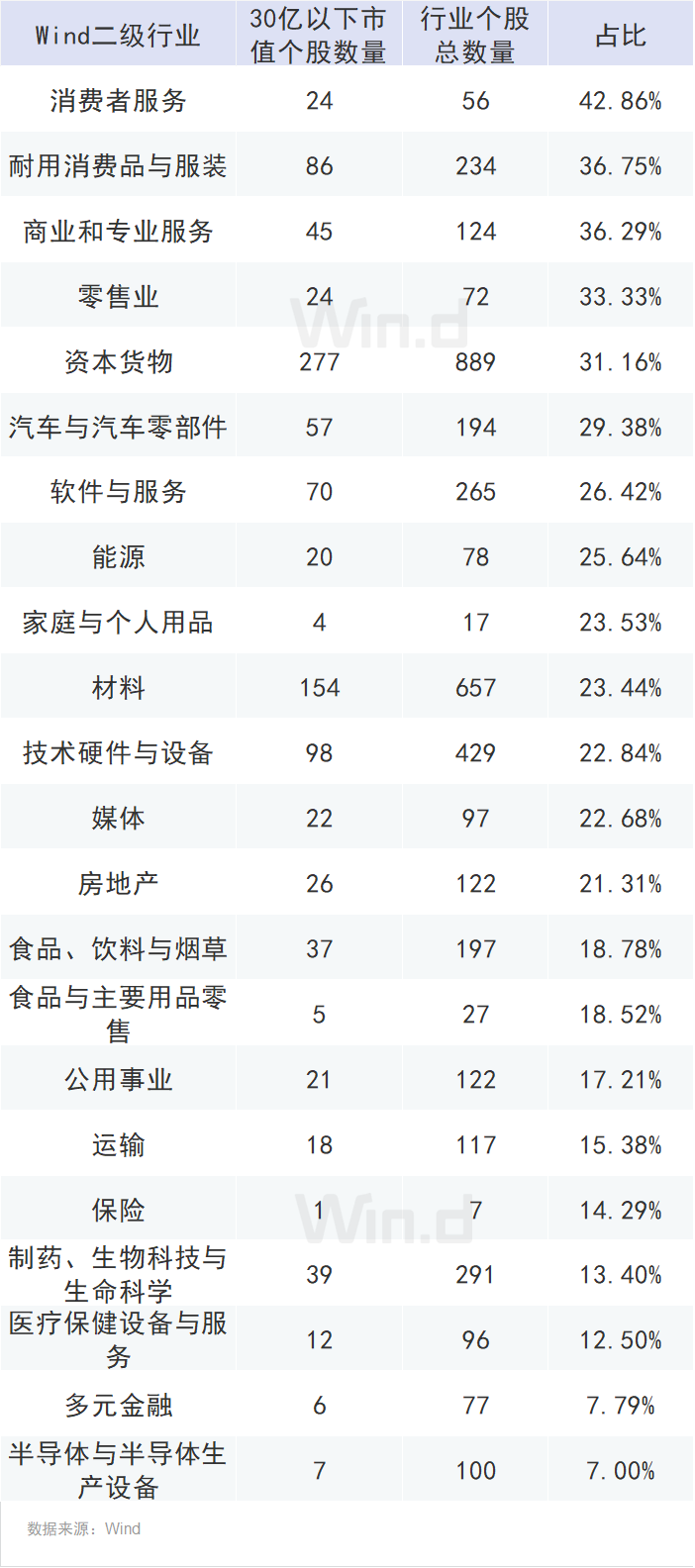 在证监会表态将严打后,可能会有一批资金出逃小市值公司,因此下周一我们拭目以待这些小市值个股表现。Wind数据显示, 目前A股4312家上市公司,最新市值低于30亿达1053只,占比24.4%, 可见A股中小市值个股并不少。其中 消费者服务行业小市值个股比例最高,达42.86%,紧随其后耐用消费品与服装、商业和专业服务等4大行业里小市值个股比重也较高,均超过30%。而多元金融和半导体与半导体生产设备行业中公司市值均较大,小市值公司比例均在10%以下。