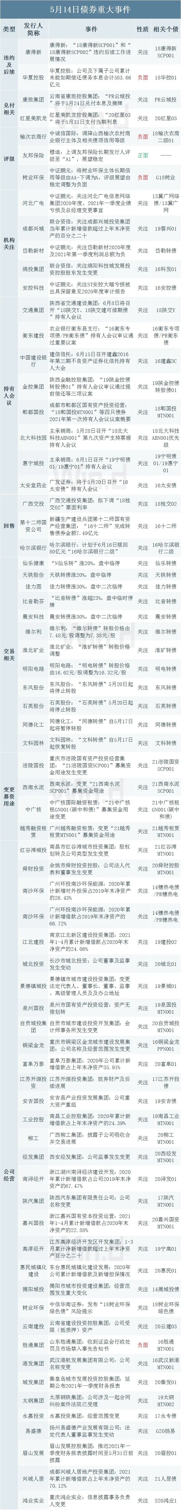 5月14日,流动性稳中偏松但消息面淡静,银行间主要利率债收益率窄幅波动,国债期货小幅收涨;一级发行延续向好,国债和进出口行债中标收益率均低于中债估值;冀中能源集团债大跌,“18冀中能源MTN003”跌超16%,“18冀中能源MTN004”跌近15%。交易员表示,因五一假期本月例行缴税顺延,缴税未至资金供给暂无忧,且短期地方债缴款亦压力有限;下周的关注重点还是税期将至及地方债发行可能带来的资金面变化。