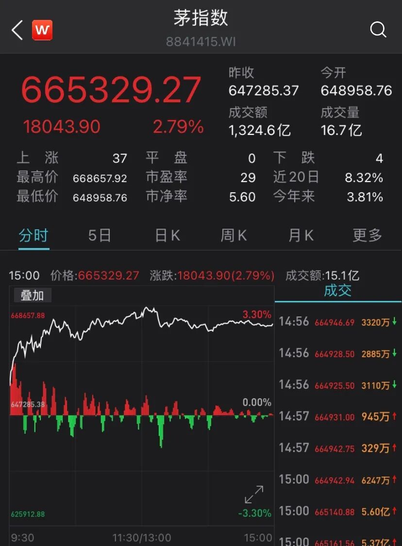 与此同时,作为代表大蓝筹的茅指数亦大涨2.79%。