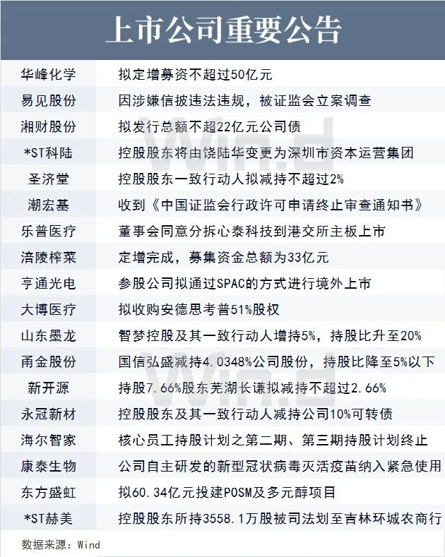 3、【债券重大事件】华夏控股:公司及下属子公司累计未能如期偿还债务本息合计583.66亿元;中诚信国际:将山西榆次农村商业银行的主体信用等级由A+调降至A-;中证鹏元:将树业环保主体长期信用等级由AA-下调为A,评级展望由稳定调整为负面;穆迪:上调友邦保险长期发行人评级至“A1”,展望稳定;山东胜通集团:收到证监会行政处罚及市场禁入事先告知书;“N仙乐转”、天铁转债、“比音转债”涨20%,盘中临时停牌;佳力转债、震安转债涨30%,盘中二次临停等。