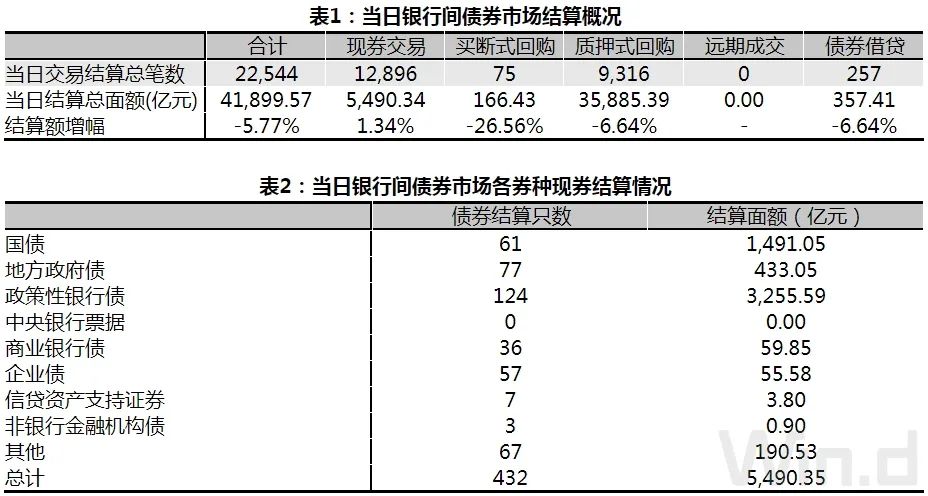 5月17日(周一),全国银行间债券市场结算总量为41,899.57亿元,较上日下降5.77%,交易结算总笔数为22,544笔。其中,质押式回购35,885.39亿元,买断式回购166.43亿元,现券交易5,490.34亿元,债券借贷357.41亿元。银行间债券市场回购利率整体上行,其中,7天回购利率上行15.9bp至2.183%。