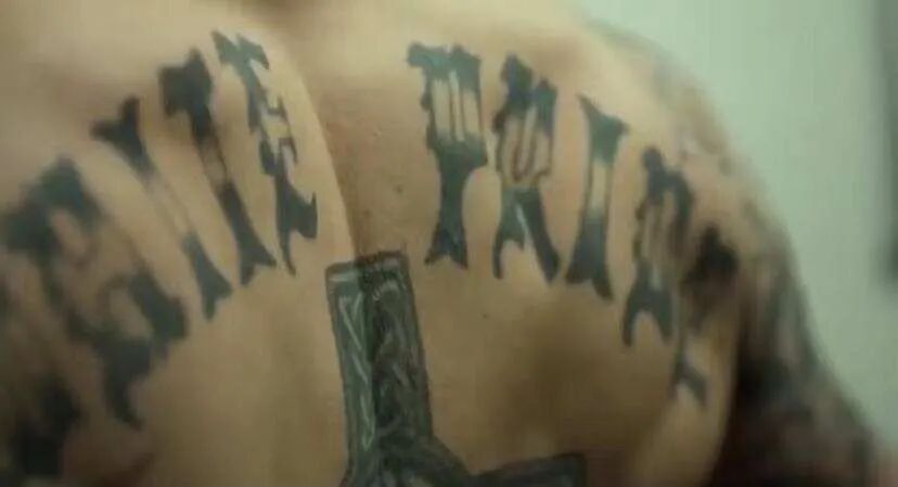 同一时间,白人帮派也迅速扩张。 1967年,在同一地点,另一帮极度歧视黑人、崇尚白人至上的白人成立了雅利安兄弟会,其目的十分明确,就是对抗“黑色游击队家族”。 帮派内的白人认为白种人才是美洲大陆上的霸主。因此,在监狱里,白人帮派与黑人帮派带有强烈的种族仇恨意识,纹身的区别也十分鲜明。 · 黑白世仇 他们身上的纹身符号大多以white pride(白色骄傲)、纳粹铁十字、万字旗为主。
