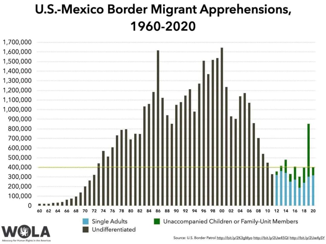 美国监狱里除黑白两股势力之外,另一波来自中南美洲的帮派势力也在飞速崛起。 中南美洲和墨西哥大量游民涌入美国的同时,一批不会英语的老墨们发现加入黑帮、贩毒比较挣钱,因此美国各地的监狱里收押了大批墨西哥裔犯人。 · 80年代的美墨边境,被逮捕的墨西哥偷渡者