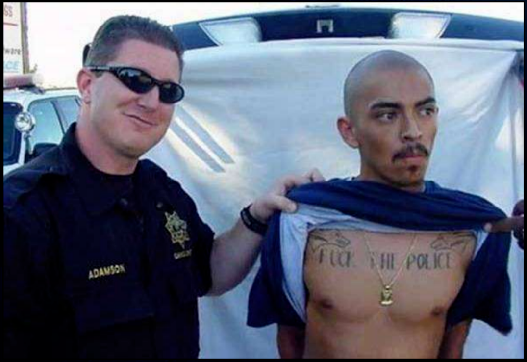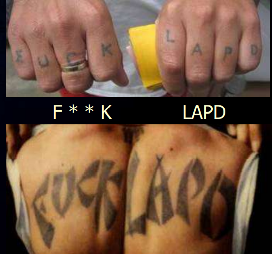 · 警方至今都搞不清楚这一连串数字背后的作案动机 也有一些罪犯的纹身,让警方摸不着头脑,甚至十分滑稽。 一些监狱大哥为了彰显对抗洛杉矶执法机构的无畏精神,干脆将“Fxxk LAPD”(去你妈的,洛杉矶警察)纹在明显的部位。