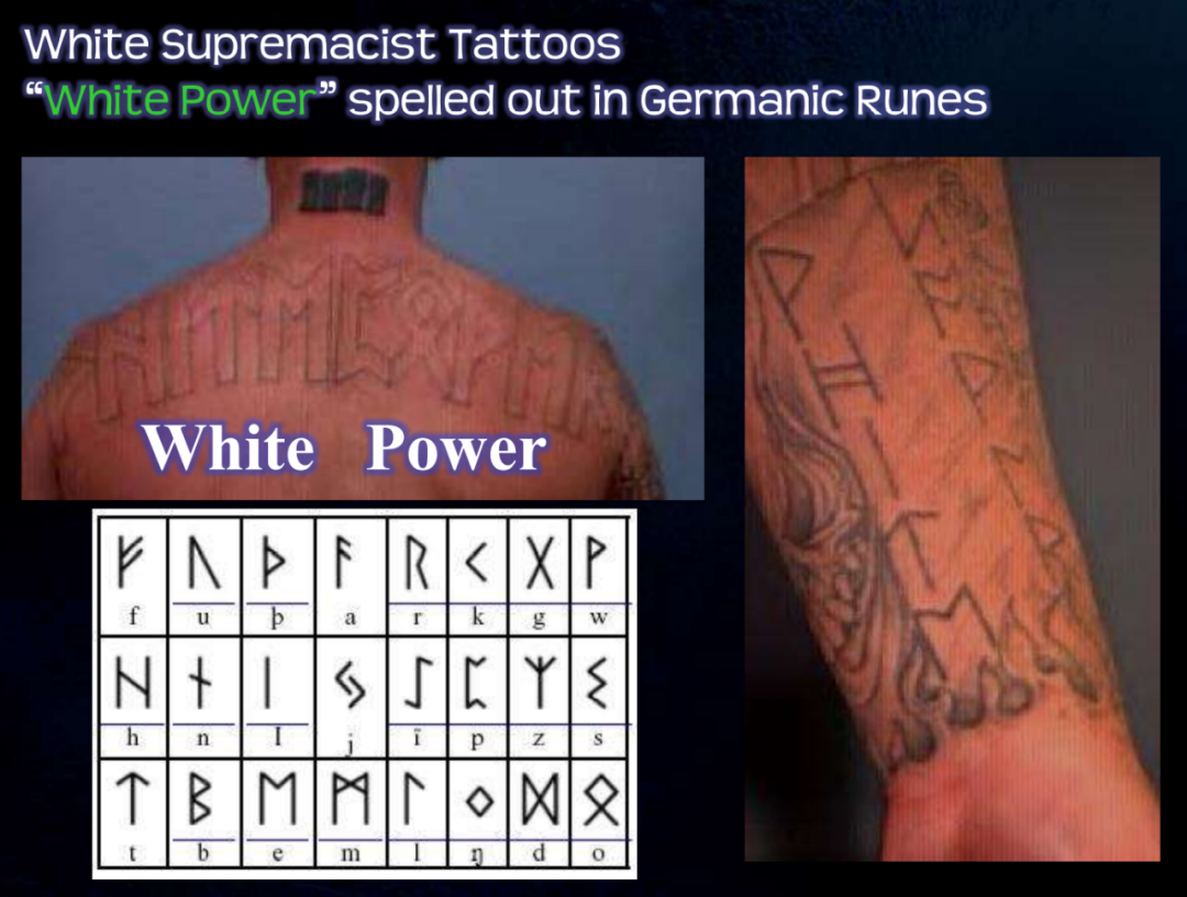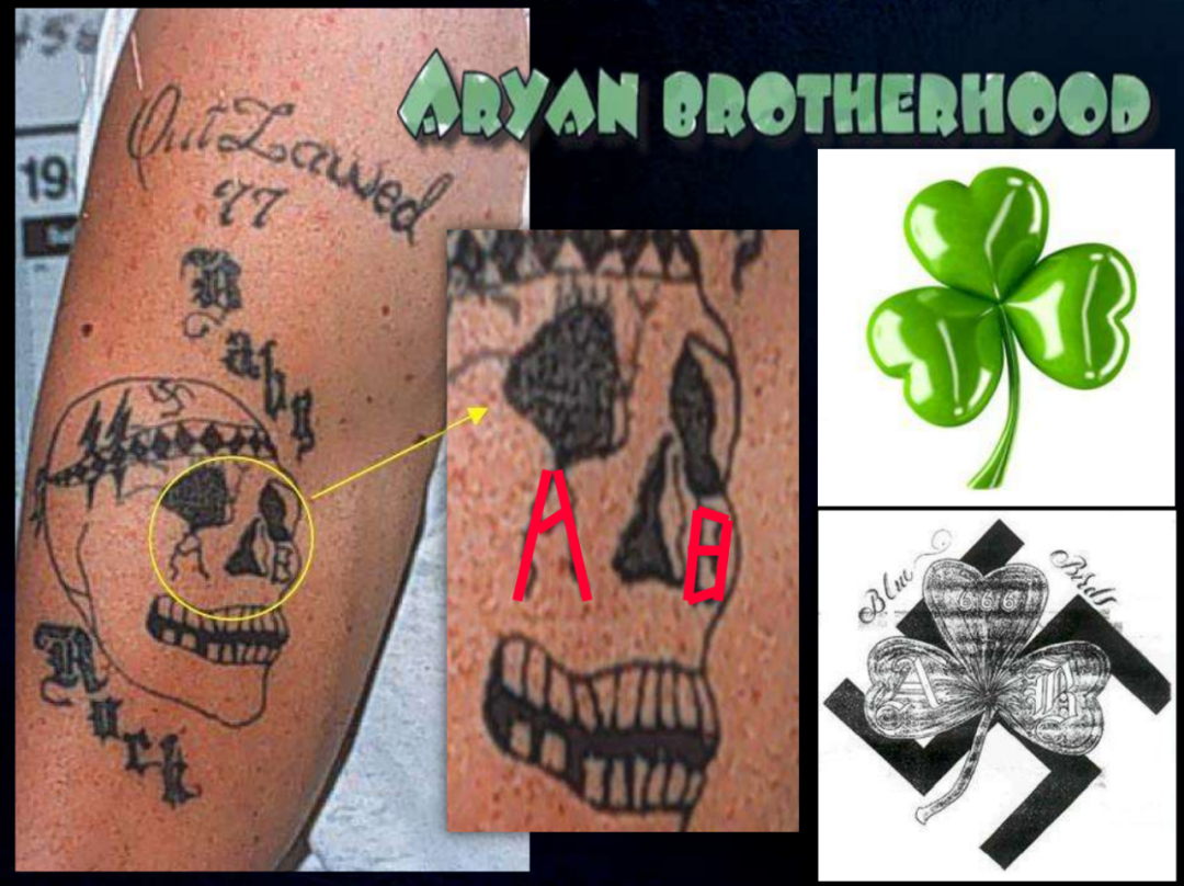 但是,这些纹身图案、样式并不是一成不变的,它们会像一个系统一样不断更新。 同样信奉“白人至上”的“雅利安兄弟会”(ARYAN BROTHERHOOD),会将帮派的英文缩写“A”“B”与幸运草或者是代表死亡的骷髅结合。