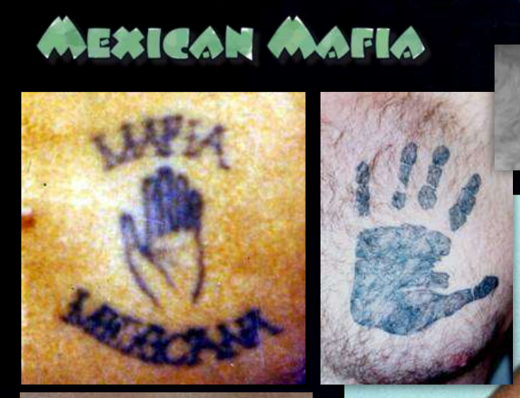 · 美国边境管理局统计的1960~2020年偷渡者数量 墨西哥裔强势加入了美利坚监狱内的帮派斗争,其中有这么三个主要的帮派: The Mexican Mafia (墨西哥黑手党)、Texas Mexican Mafia(德州墨西哥黑手党)、Texas Syndicate(德州辛迪加)。 这三个帮派虽说都是以墨西哥人为主,但是各个帮派的纹身都有一些区别。 起源于加州的The Mexican Mafia的标志纹身主要以字母“EME”“MM”“M13”为主。 “EME”翻译成英语就是字母“M”,象征着Mexican(墨西哥人)。“MM”和“M13”则都是“Mexican Mafia”的缩写。