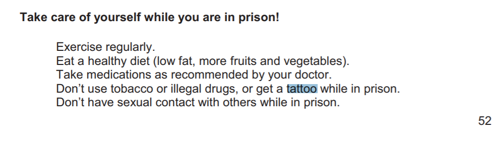 想要得到这些纹身,自己在纹身店里纹的是得不到尊重的,你必须在监狱中完成这一项使命。但问题又来了,美国监狱法明令禁止在监狱中纹身,为什么? 原因很简单,监狱纹身极其不卫生。 · 《联邦监狱》的规定 对于“勤劳、朴实”的狱友们来说,他们会利用手边的任何工具攒出一把纹身枪,一小盒纹身油墨。