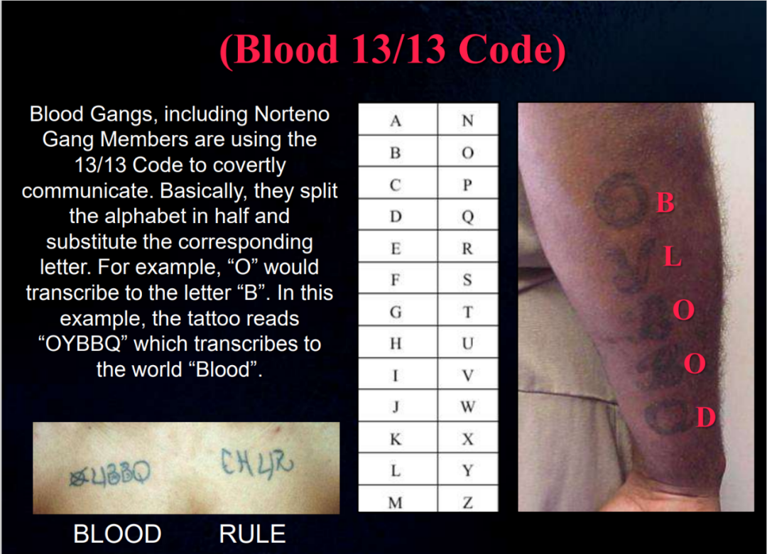 而更加进阶一点的加密纹身,莫过于“血帮”的“ Blood 13 code ”;这类纹身则是像特工暗号一样,一般人无法辨别。 不得不说,血帮的老哥很聪明,他们把将字母表分成两半,然后替代相应的字母。例如,“O”会转录为字母“B”。 在这个例子中,纹身的内容是 “OYBBQ”,它就会被转录为“BLOOD”。