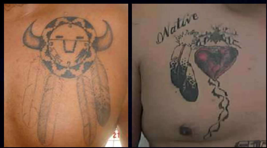 当然,在这个手册中,还介绍了一些美国监狱内的少数族裔的纹身特征。 比如来自印第安保留地的印第安帮派成员会纹羽毛、酋长头盔。