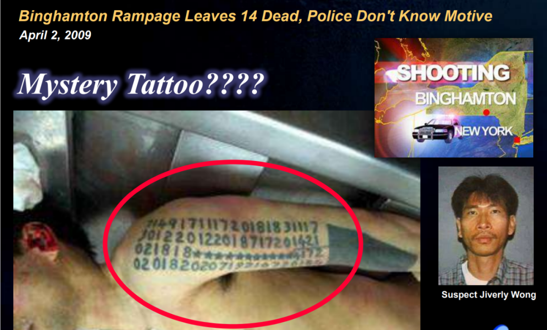 除了血帮的“双13”字母密码很隐秘之外,同样隐秘的纹身是白人狱友使用的一种非常古老的“卢恩字符”。 解读这种加密纹身,你还需要一张卢恩字母表作为密码本,仿佛谍报人员一样。 · 依旧是信奉“白人至上”的狱友 纹身加密的方式还有很多种,我只提到了其中几个比较有代表性的加密纹身。 但是,还有一些被警方收录的犯人纹身,警方至今无法从这些纹身上获得有用的犯罪信息,在此就和大家说说吧。 2009年,美国纽约发生了一起恶劣凶杀案,一共14人丧命。而警方在被击毙的嫌疑犯身上发现了十分古怪的数字纹身。