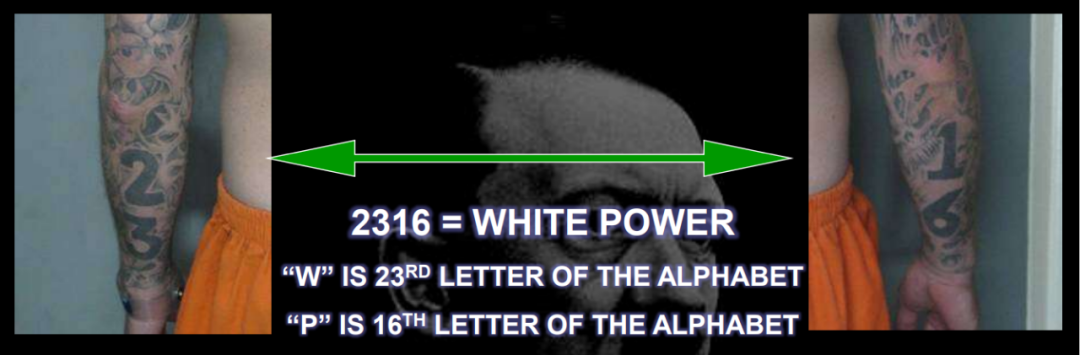 对应字母表,23和16分别是“W”“P”;“WP”=WHITE POWER( 白色力量 ),妥妥的白人帮派。 比如一个黑人纹了这么几个数字“276”,就直接对应了“黑色游击队家族”的英文缩写“BGF”。